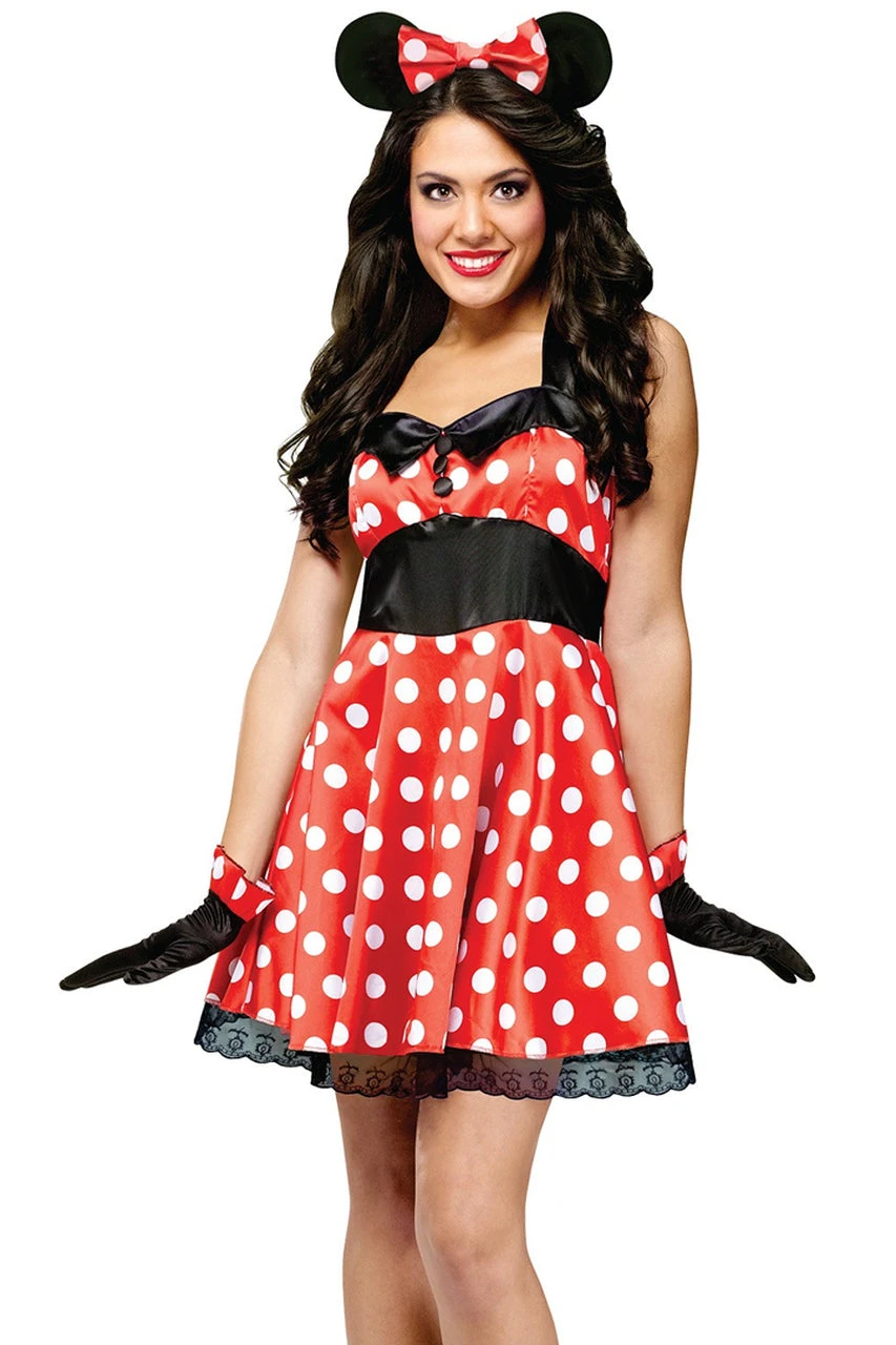 Infamously cute, this Pinup Miss Mouse Costume features the perfect combination of charming and significant. This three piece set includes a polka dot mini dress with lace trim hemline, pinup bodice, elastic back, black satin gloves with polka dots, and mouse hears headband.
