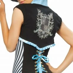 This Fashionably Late Rabbit Costume takes you back to Wonderland into the world of Alice and her mysterious friends.The large top hat has a bunny ear applique and bowtie in black/white design, similar to the Mad Hatter. The black cropped jacket trimmed in pleated baby blue has an embellished shield design on back. A toy pocket watch cleverly attaches to the black and white corset with faux fur front and blue lace-up back. Completing this form-fitting outfit is a black pencil skirt reaching mid-thigh, with blue-trimmed pleats in the back slit. Sizes: S (0-3), M (4-7), and L (8-10). Dry cleaning recommended.