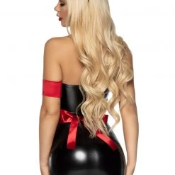 This four-piece, Naughty Nurse costume includes a black, wet look garter dress with a zip up front, red trim, low cut bust, heart apron, arm band, and head piece.