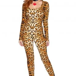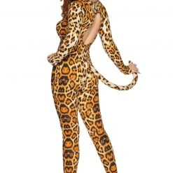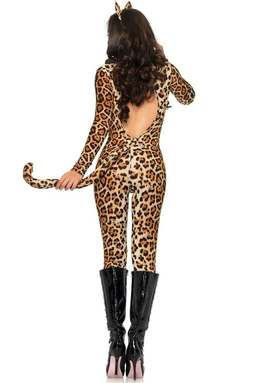 This three-piece, Cool Cougar costume includes an animal print bodysuit with long sleeves, a keyhole cut out back, attached tail, an ear headband and a spiked collar with an attached heart charm.