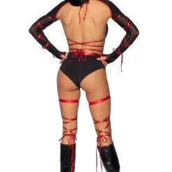 This five-piece, Lethal Ninja costume includes a black strappy wrap around top with an attached black mesh shrug, V-cut bottoms, leg wraps, face mask, and matching hair ties.