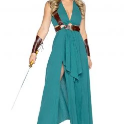 This four-piece Warrior Maiden costume includes a green gauze dress with high cut slits, O-ring detail, a faux leather buckle shoulder harness and matching arm cuffs.