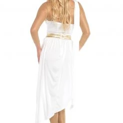 Rule Athens in this four-piece, Golden Goddess costume featuring a white draped dress with high side slits, gold leaf trim, a one-shoulder silhouette, a sheer golden catsuit and a gold braided head piece.