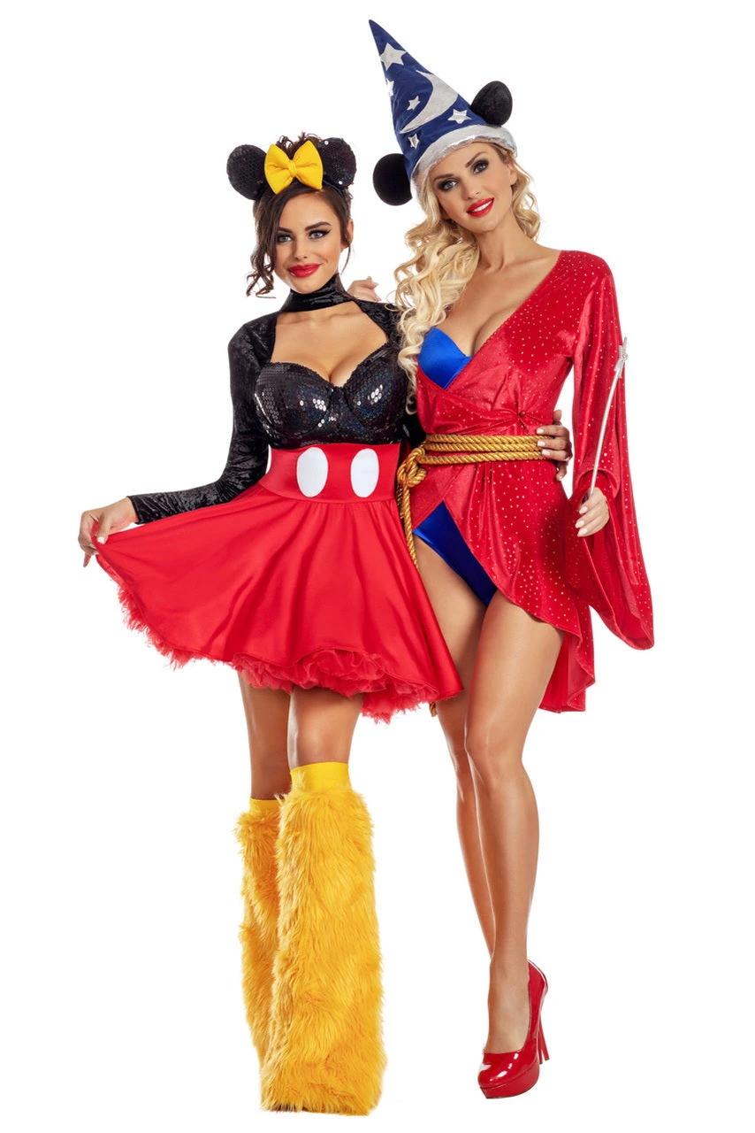 This Fantasy Mouse costume includes a royal blue bodysuit, a red glitter velvet robe with a gold rope belt, wand and mouse ear headpiece with attached hat.