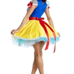 This Snow Apple Princess costume includes a blue and yellow dress with embroidery details, ribbon and bow appliques, puff sleeves, ribbon tie back, and a matching headpiece. (Petticoat not included.)