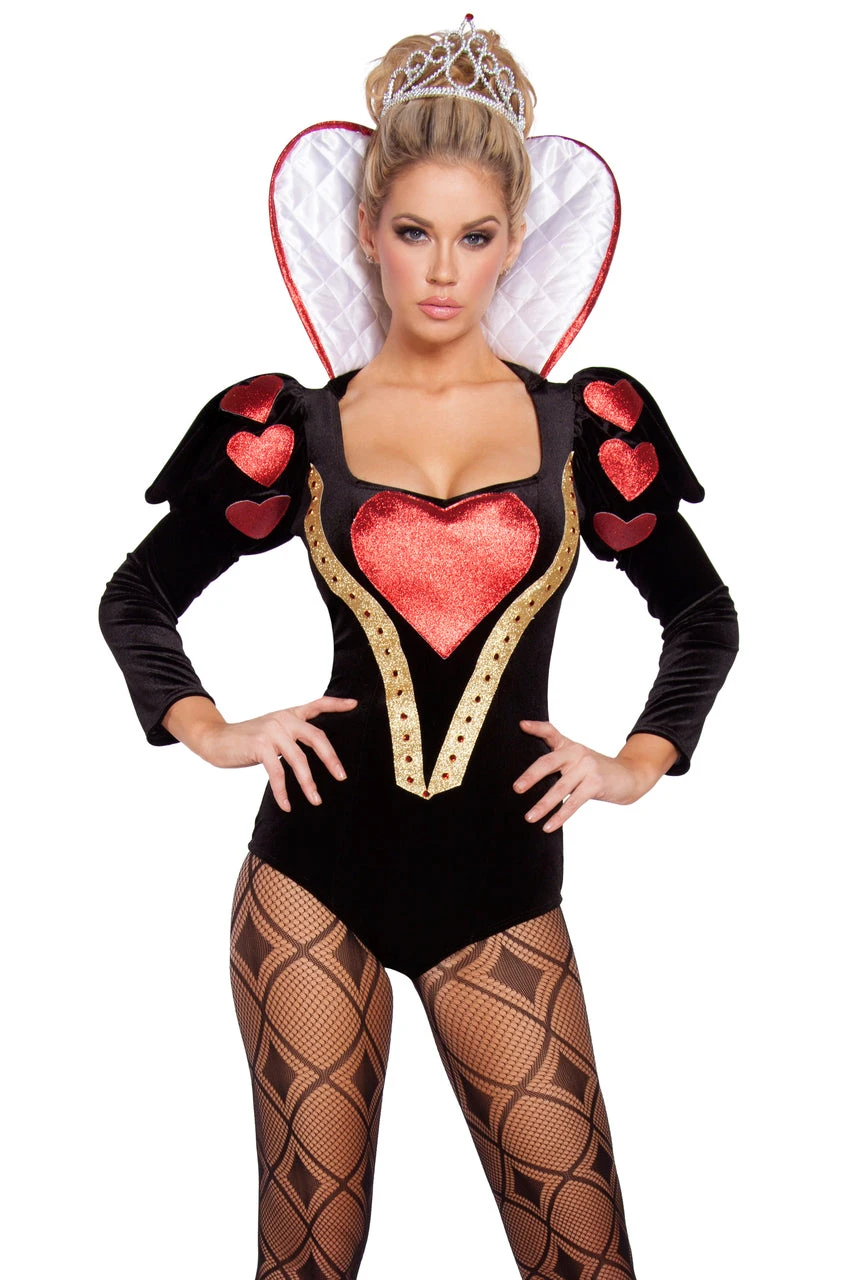 Practice your infamous line “Off with their heads!” in this 2 Piece Big Heart Vixen Costume. This two-piece Queen of Hearts costume features a black romper with rhinestone & heart applique detail and attached white quilted collar. Includes rhinestone tiara. *Pantyhose sold separately.