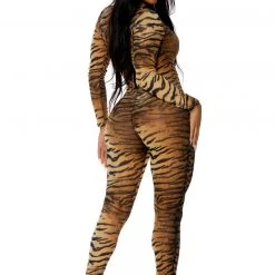 You’ll look fierce in this Innocent Tiger costume featuring a tiger print bodysuit with a low cut out and strappy front, built-in harness, a ring detail and ear headband. (Stockings not included.)