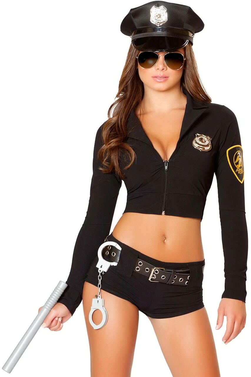 This eight-piece Officer Hottie costume includes a black, long sleeve crop top, matching booty shorts, a belt, badge, handcuffs, baton, and police hat.