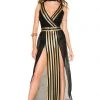 This four-piece, Ruler of Egypt costume includes a long gold gown with a keyhole cut out bust, cross detail, a beaded neckpiece, gold gloves with draping sleeves, and headpiece.