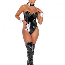 This Playboy Seductress Bunny costume includes a black stretch vinyl bodysuit with a built-in corset, a zipper closure, white ribbon, tail, wrist cuffs with cufflinks, calor, bow tie, and bunny ears.